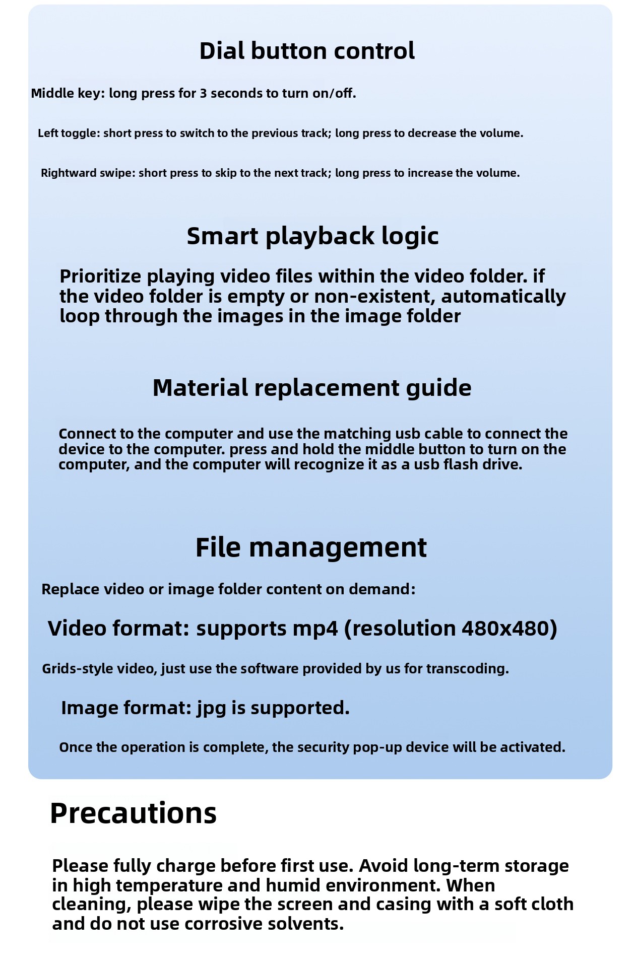 - Memory Capacity: Standard version stores multiple files; upgraded version supports 25–30 videos (up to 5 minutes each, 100MB total).