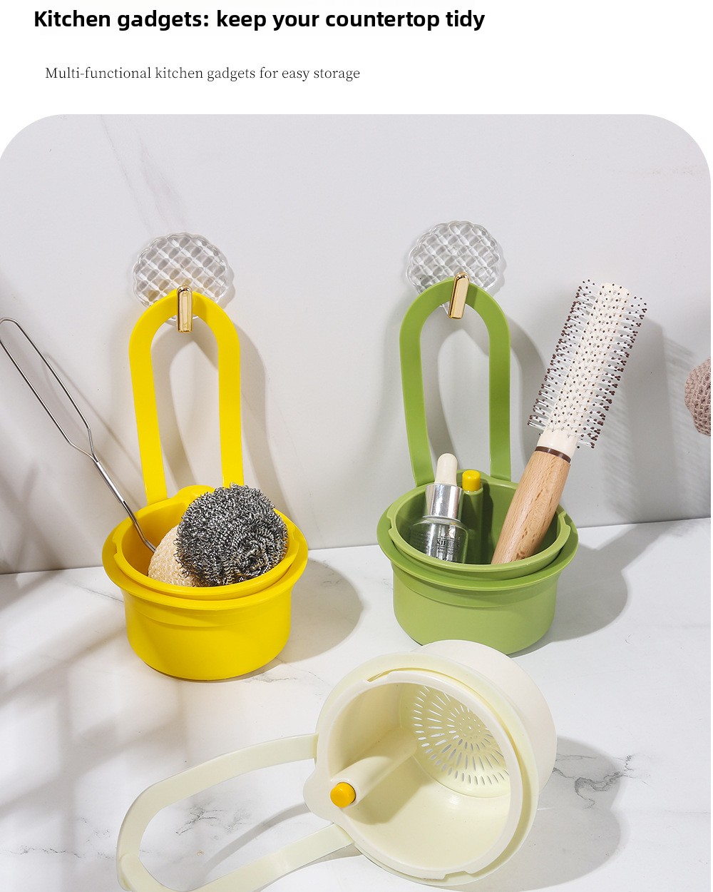 Hanging sink drain basket with dual-layer design for efficient food residue filtering. Features food-grade PP plastic construction and drainage holes for quick water removal. Installs conveniently over your sink to save counter space while organizing fruits, vegetables, and dishes.